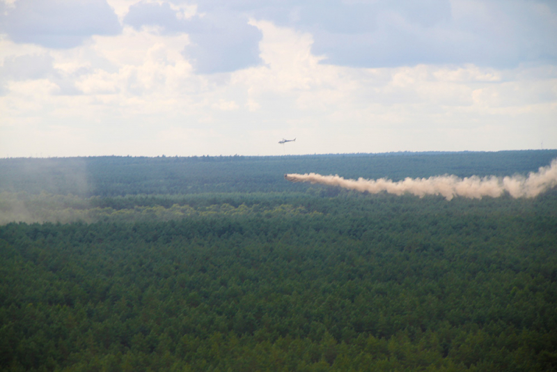 Die Ausbringung erfolgt wie in den vergangenen Jahren mit dem Hubschrauber, wobei in diesem Jahr auf Grund der zu kalkenden Flächengröße zwei Hubschrauber im Einsatz sein werden. Ausgebracht 3 to/ha kohlensaurer Magnesiumkalk in erdfeuchter Form. Sofern die Witterungsbedingungen ein optimale Flugbedingungen ermöglichen kann ein Hubschrauber am Tag bis zu 50 Hektar kalken.